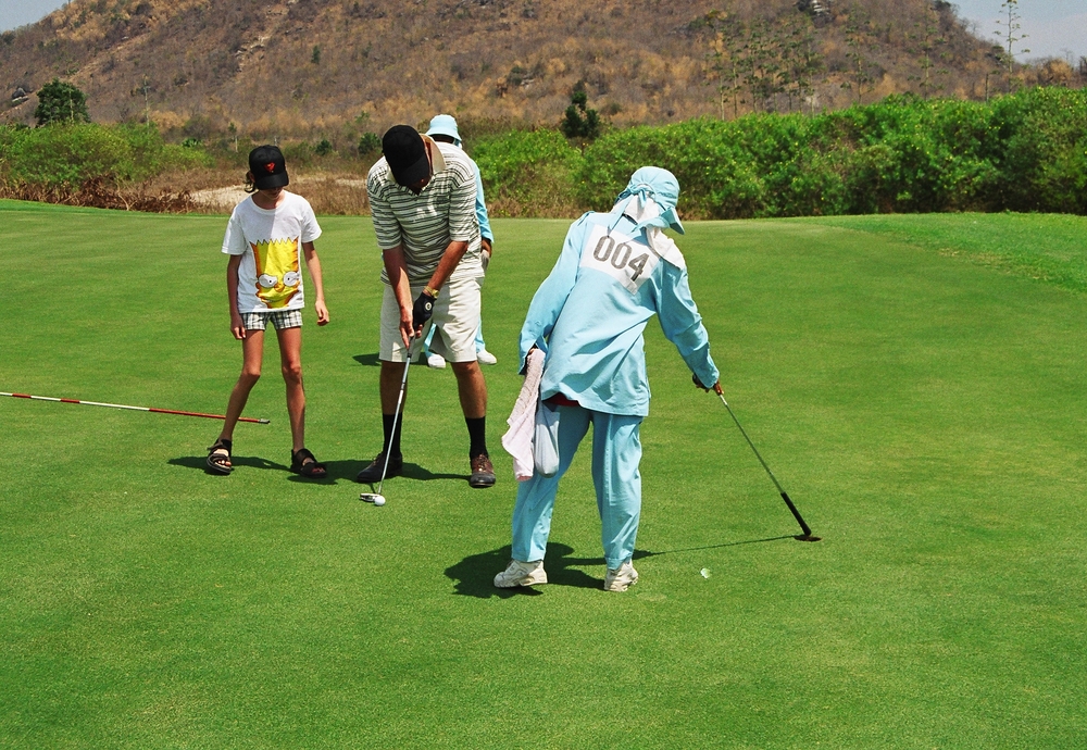 Sawat does everything for me but swing the club. She drives the cart, gardens divots, keeps score, and when my last ball plunks into a lake, she finds others in the bushes. Six years at Laem Chabang, where caddies must pass three months of training and testing, has made her fluent in golf.