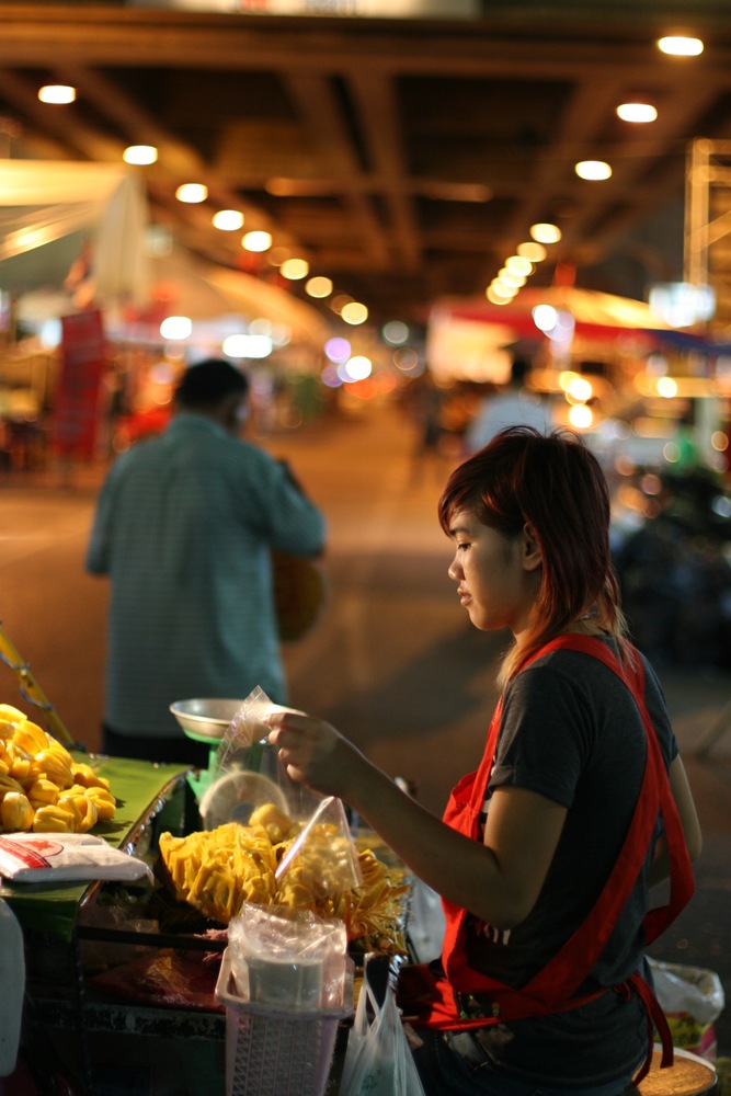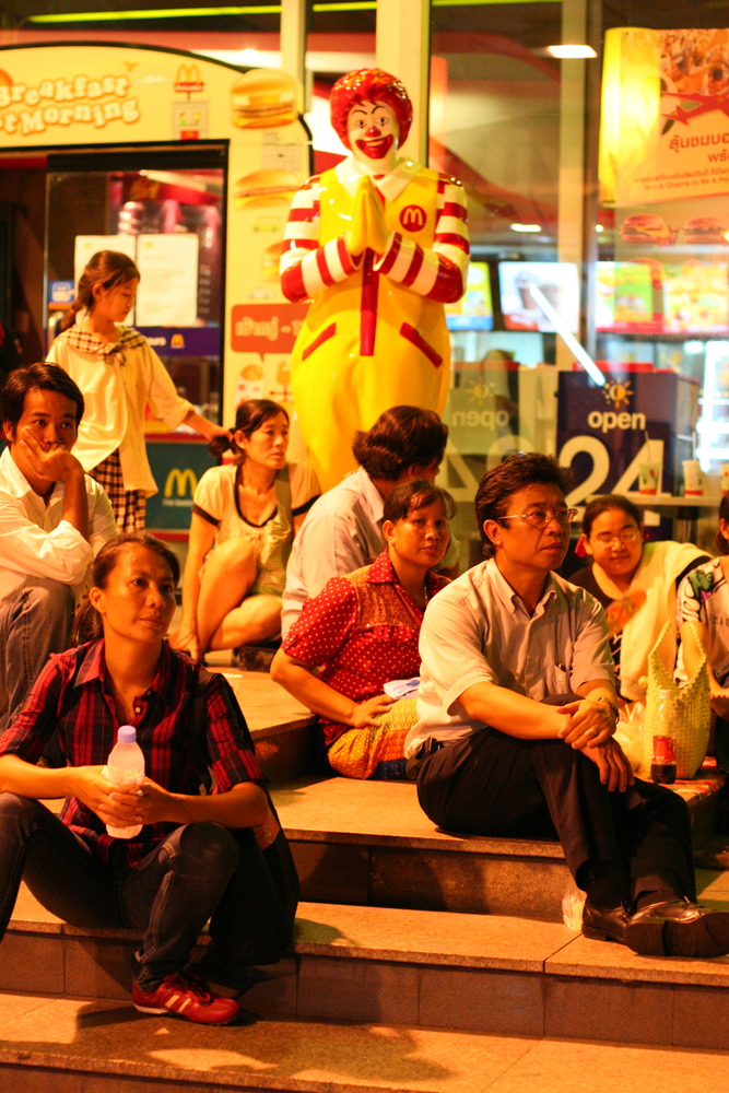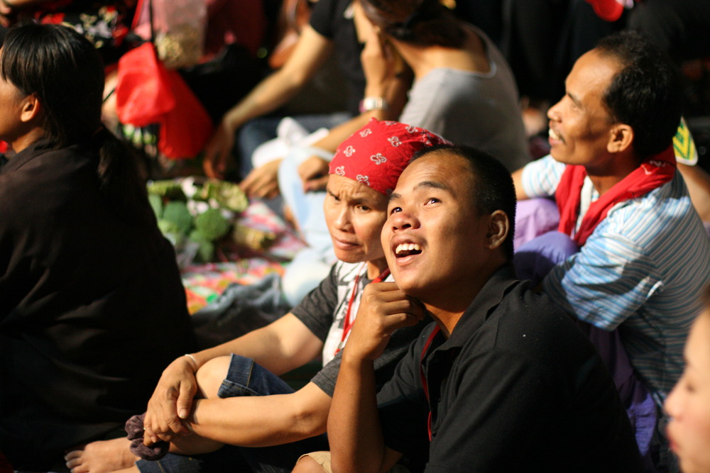 between Siam Square and Chidlom stations. The Red Shirts in these photos include a family with a small child from Pattaya, a grandmother from Chiang Mai, a grandmother from Bangkok, young male farmers and laborers from Buriram and Surin, and Bangkok-based street vendors who dawn red attire in order to pass through checkpoints and sell everything from Kanoon fruit to red star caps and slippers depicting Thai PM Abhisit. An illegal state within a state, they have set up black canvases to protect them from the coming monsoon season, and promised to bring in fresh supporters from upcountry. All photos copyright Christopher Johnson, cjinasia@yahoo.com
