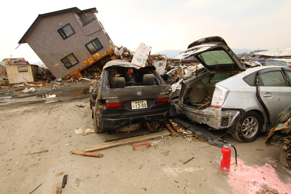 Wearing rubber boats, gloves and a white mask — like everybody else in the zone — he sifted through debris looking for his car, a white Honda. He finds white cars squashed under ships or perched atop houses and train tracks. Many leak gas and oil into the Okawa River, where screeching sea gulls sit on islands of submerged autos. None of the thousands of trashed white cars is his. “The problem is, in Kesennuma almost everybody was driving a white car,” he said.