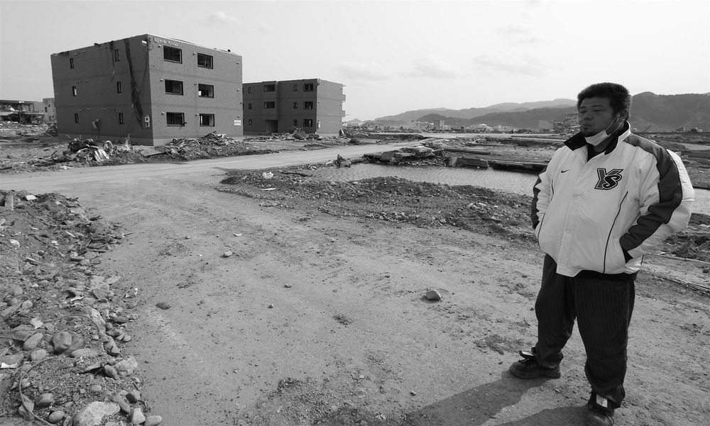 Naoki Suzuki, a truck driver, stands near the site of his home in downtown Rikuzen-Takata where his wife, Kazue, tried to ride out the tsunami as it rose above a nearby three-story apartment complex and post office. (Christopher Johnson/Special to The Washington Times)