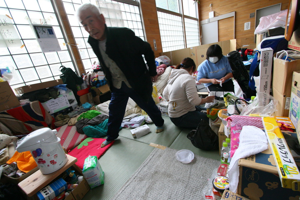 Having lost their 200-year-old farmhouse in the March 11 tsunami, they try to keep their new “property” tidy, using cardboard boxes for “walls,” blankets for cushions and window sills to hang donated clothing. Serving tea on a table found in piles of debris, they smiled to keep up appearances. But they said they can barely stand all the coughing and snoring around them. “It’s hysteria,” said the grandmother, Yoshie Watanabe, tired of kids running around. “We can never rest and think clearly here. The noise and the commotion never seem to stop.”
