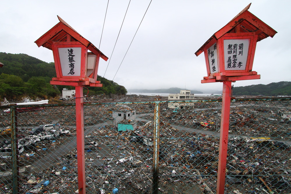 0734– Japanese lanterns at the foot of the Inari Shrine remained just above the water line of the March 11 tsunami that obliterated Otsuchi, Japan.
