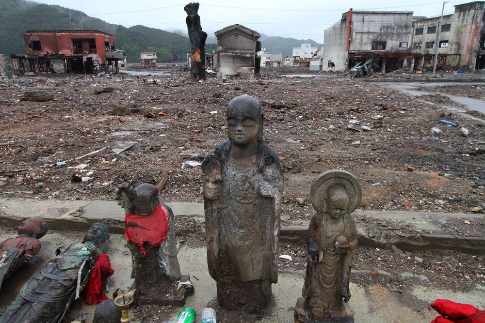 Not every temple, however, has been so lucky. The tsunami swamped the Koganji temple at sea level at the foot of a mountain in the central business area of town. A demolished car lies in the gutted ruins of the temple’s main hall, where flowers and Buddha statues preside over a wasteland of devastation.