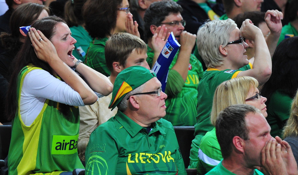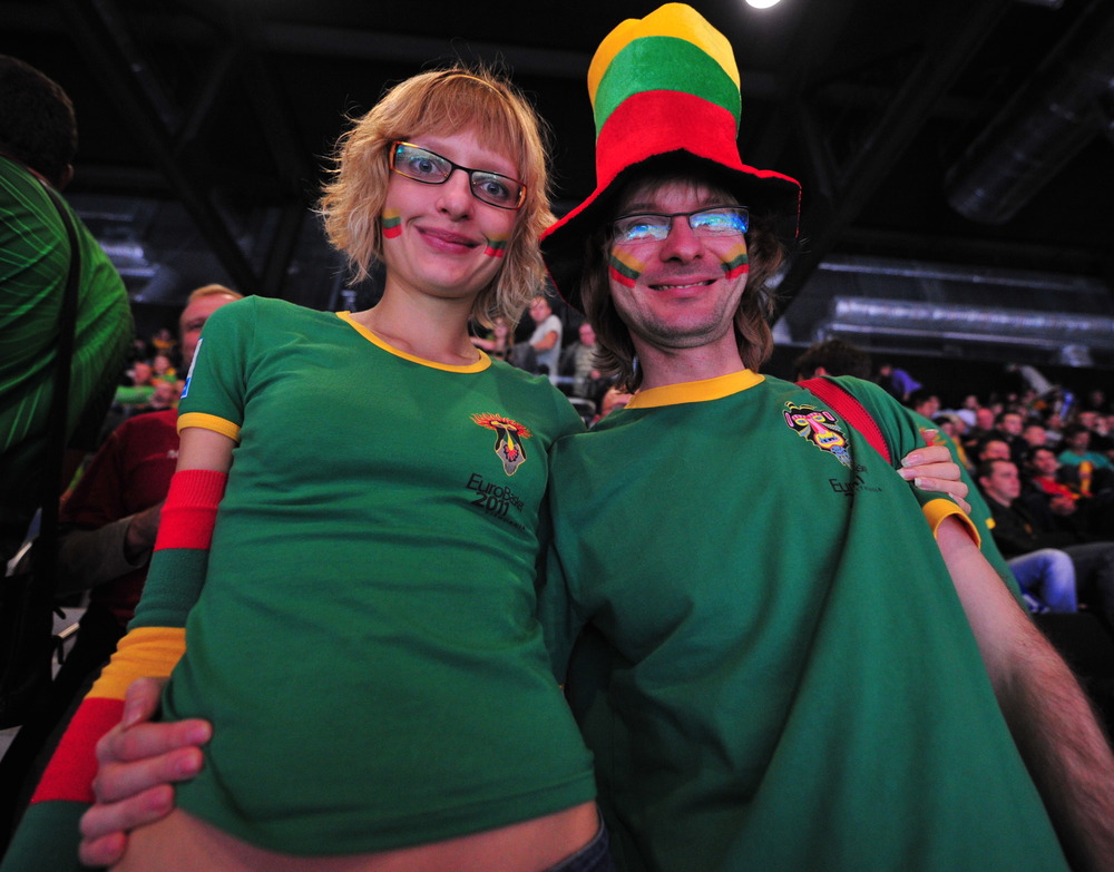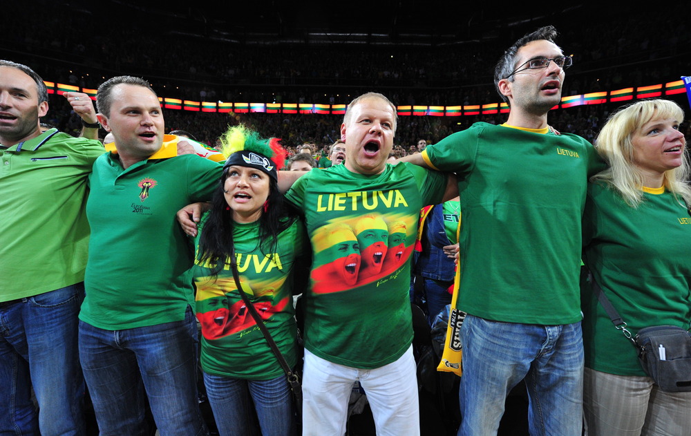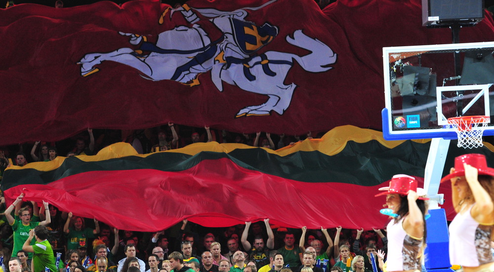 | Lithuanian fans unfurl massive flags and cover their ears from crowd noise reaching 110 decibels during Lithuania’s victory over Greece on Saturday in Kaunas, Lithuania at the Eurobasket 2011 basketball championships. photos by Christopher Johnson |