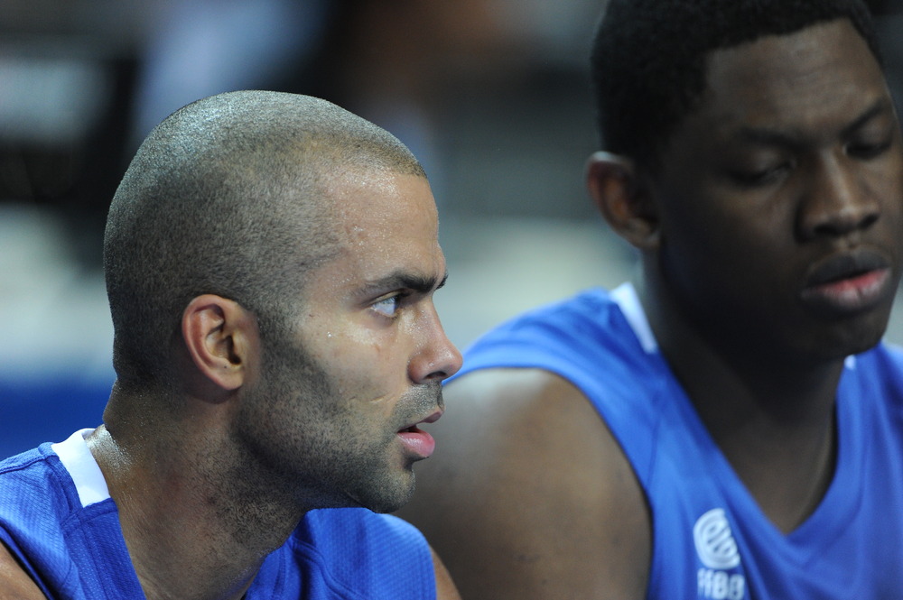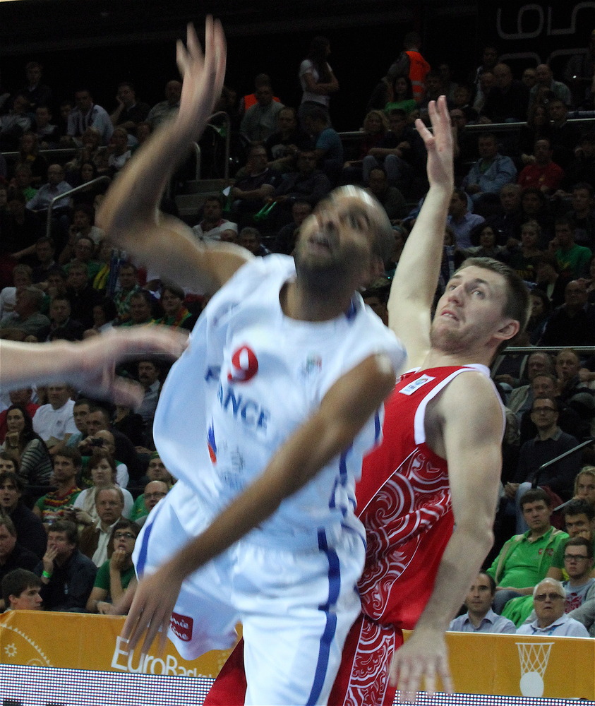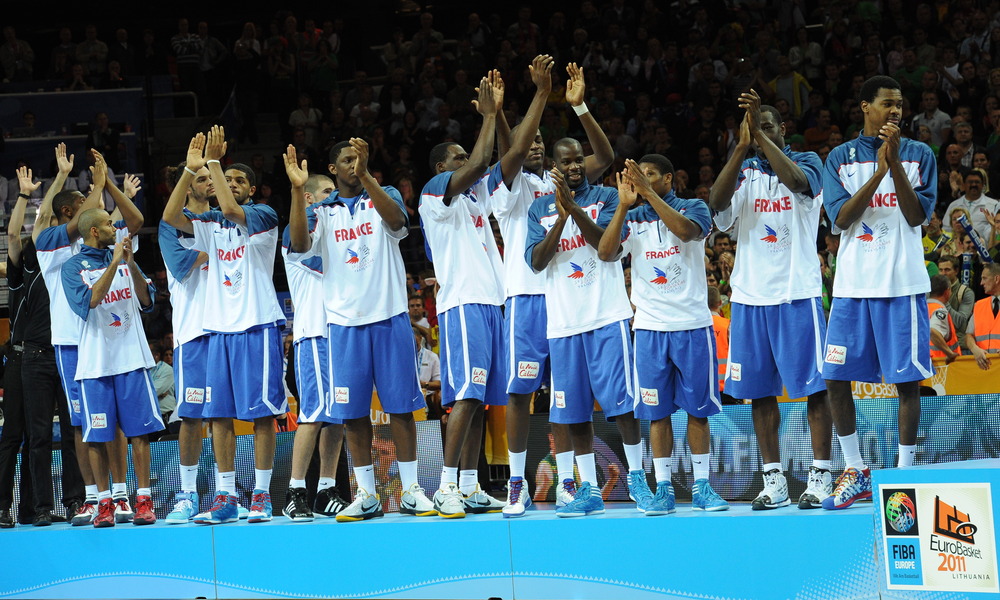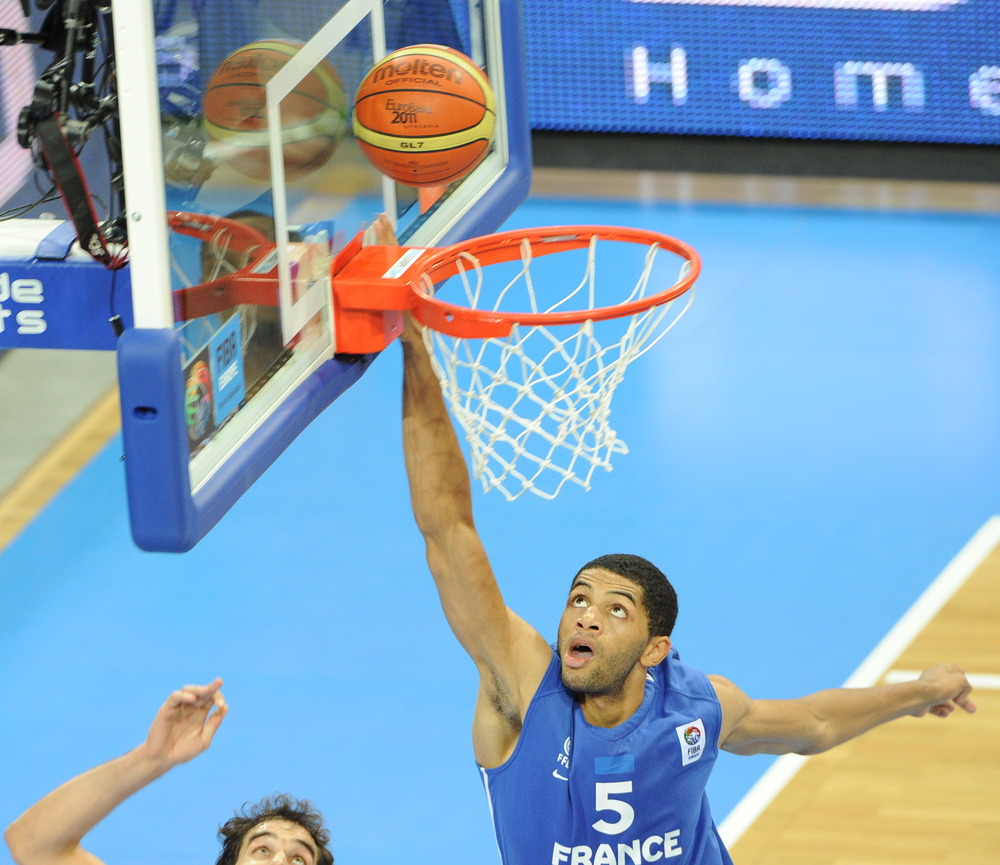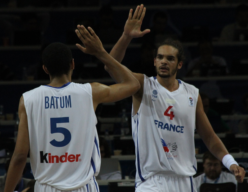 | Joakim Noah, of the Chicago Bulls, and Nicolas Batum, of the Portland Trailblazers, high-five and celebrate with teammates during France’s victory over Russia in the semi-finals of the Eurobasket 2011, which many players, coaches, and basketball officials say has an NBA playoff atmosphere. photos by Christopher Johnson |
