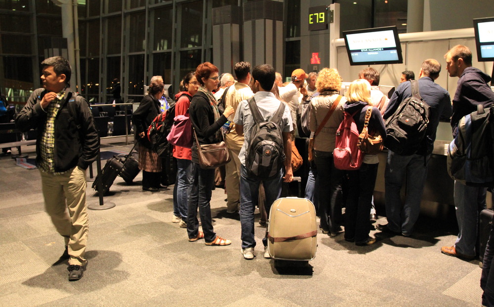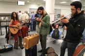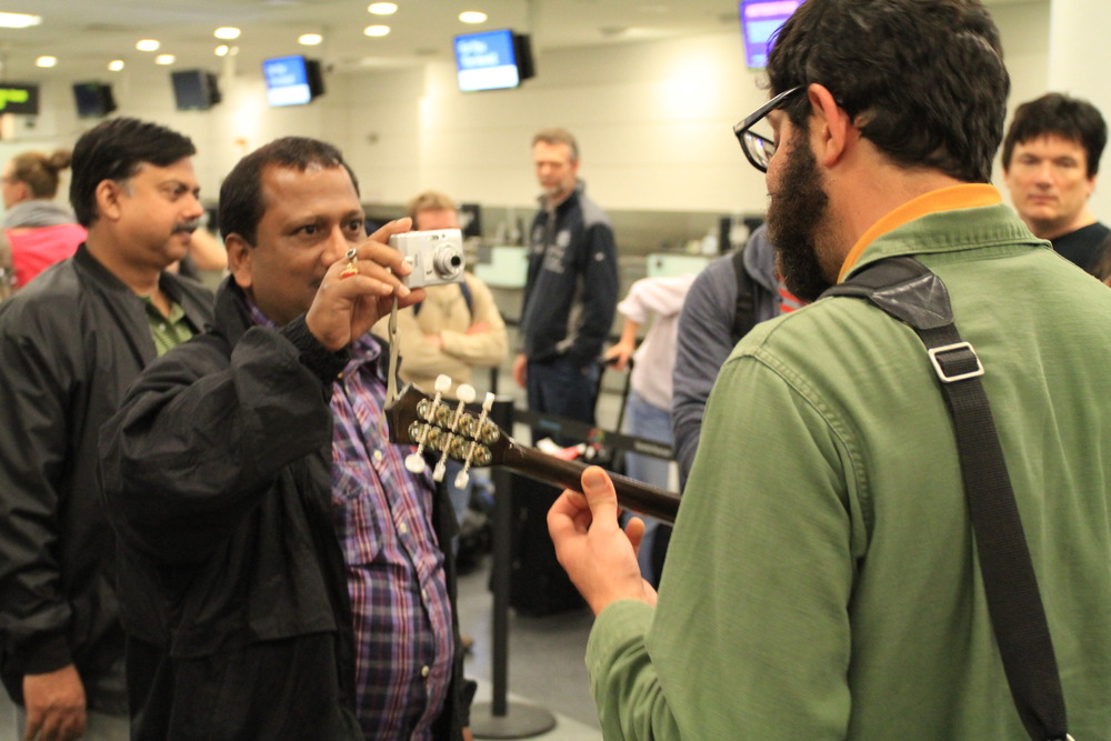 Inspired by Lemon Bucket Orkestra, the April Fishes took out their instruments and performed their songs for about a hundred weary passengers standing in line for hotel vouchers between 3 and 5 am. Passengers, and Air Canada staff, including employees called in on a few hours to sleep, seemed relieved to hear music in the airport in the middle of the night. Passengers clapped, and a group from Calcutta, led by singer Subhamita Banerjee, took souvenir photos and joined in.