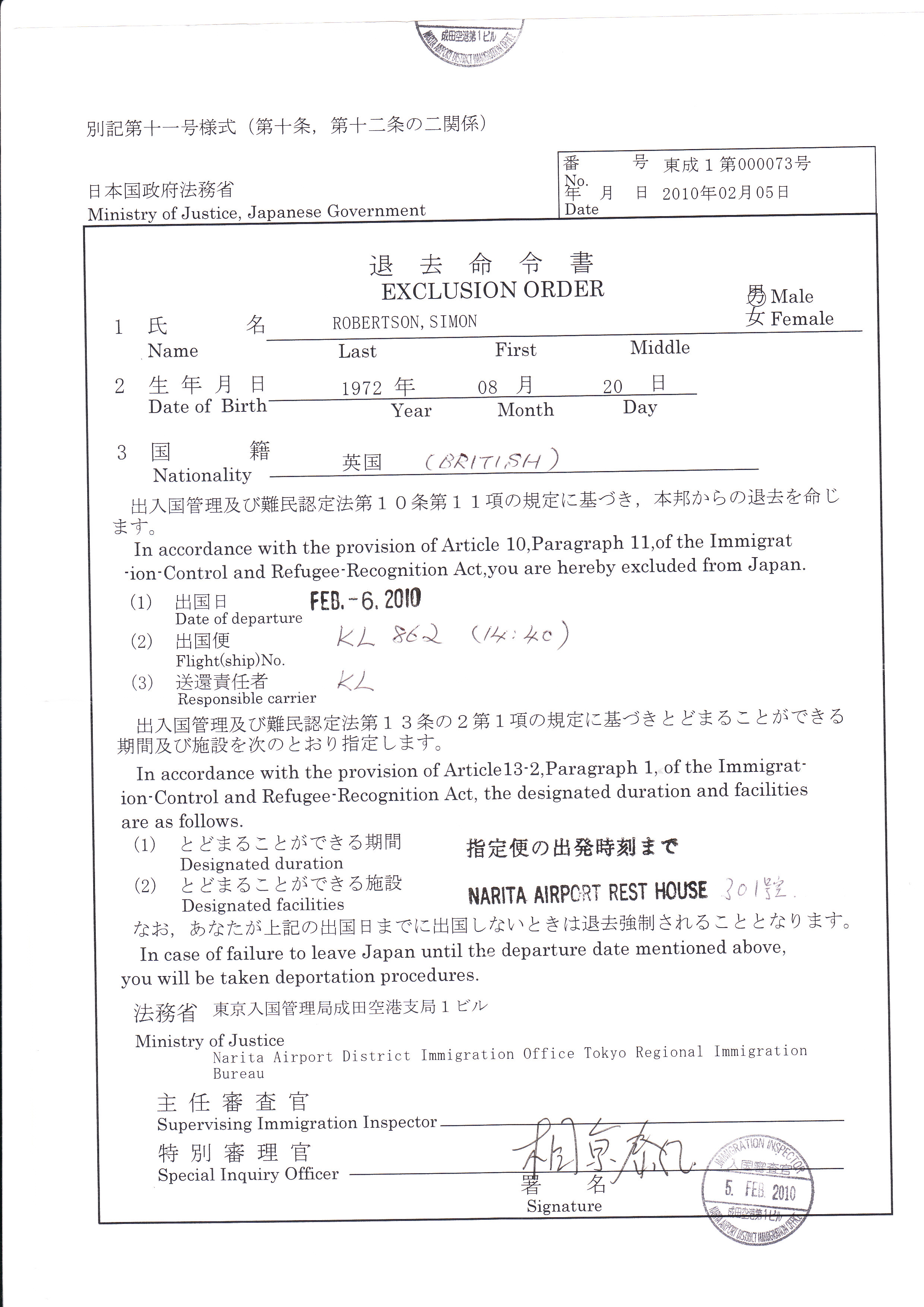 Robertson spent nearly two years seeking answers. He says a British court in November 2011 forced the U.K. Foreign Office to release a document they had kept since Feb. 10, 2010. The document showed Japan’s explanation for his deportation. According to Robertson, the document said: “The man had been detained because he had written down that he was entering Japan for business purposes, but when they called his girlfriend’s father he said that he wasn’t there for business at all.”