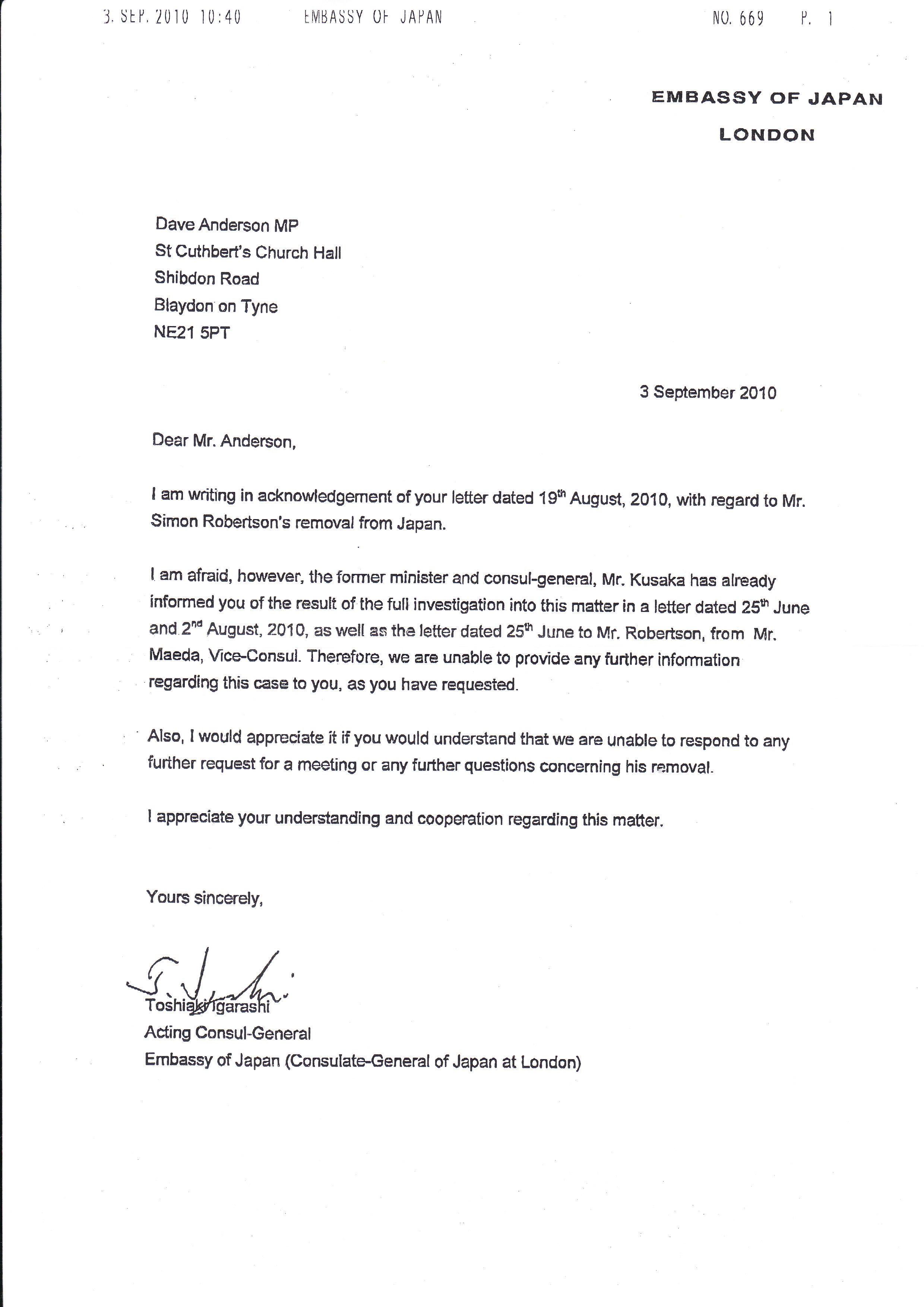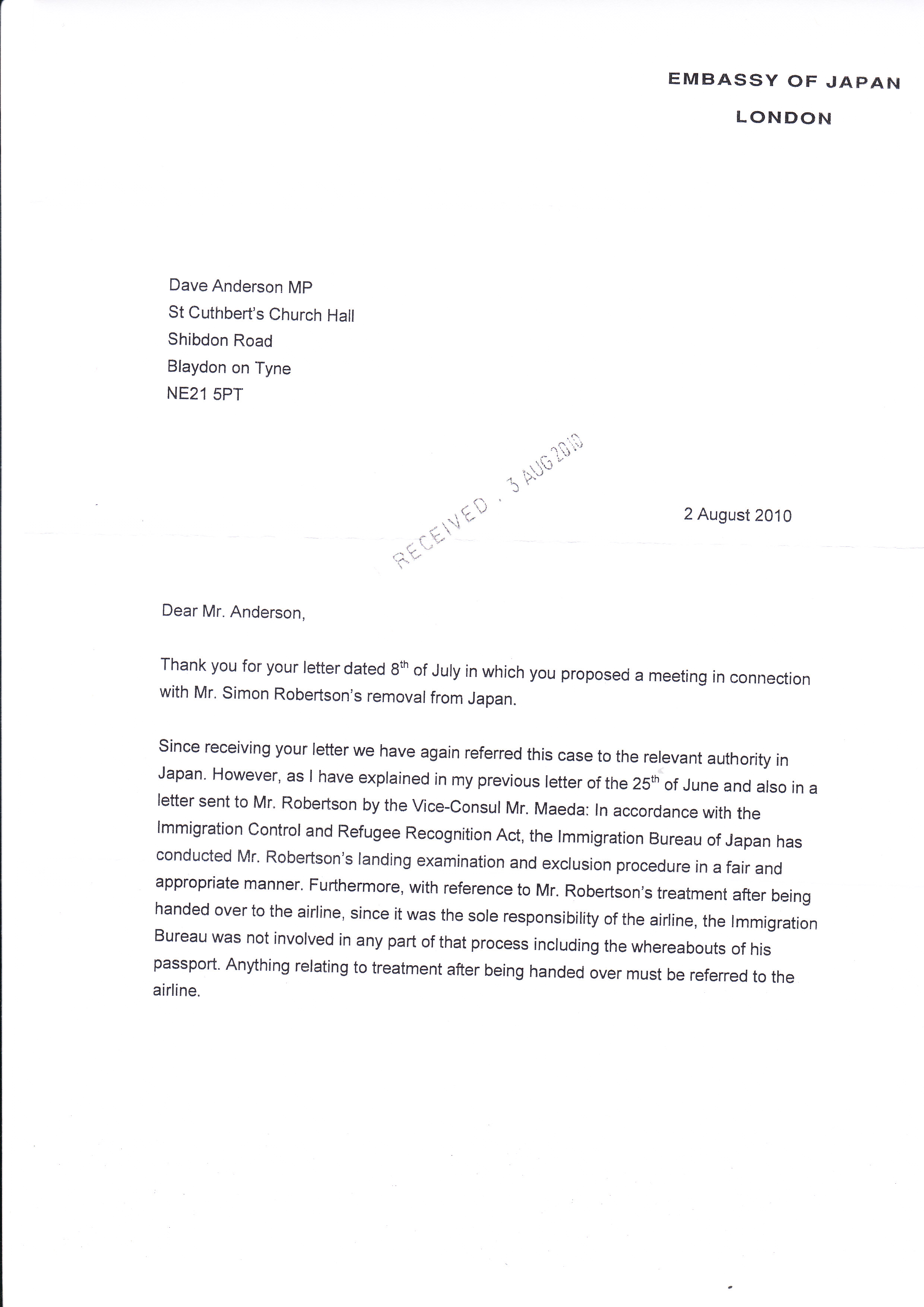 But, after a long flight from Newcastle via Amsterdam, his Japanese dream became a nightmare. Arriving at Narita airport on Feb. 5, 2010, Robertson says he was detained, abused, robbed of $1500 in his wallet, forced to pay ¥40,000 in “fees” and deported back to the United Kingdom without a passport. Saying he was a victim of an “extortion scam” at the airport, he contacted his MP Anderson, who then tried to deal with Japan’s embassy and others involved.