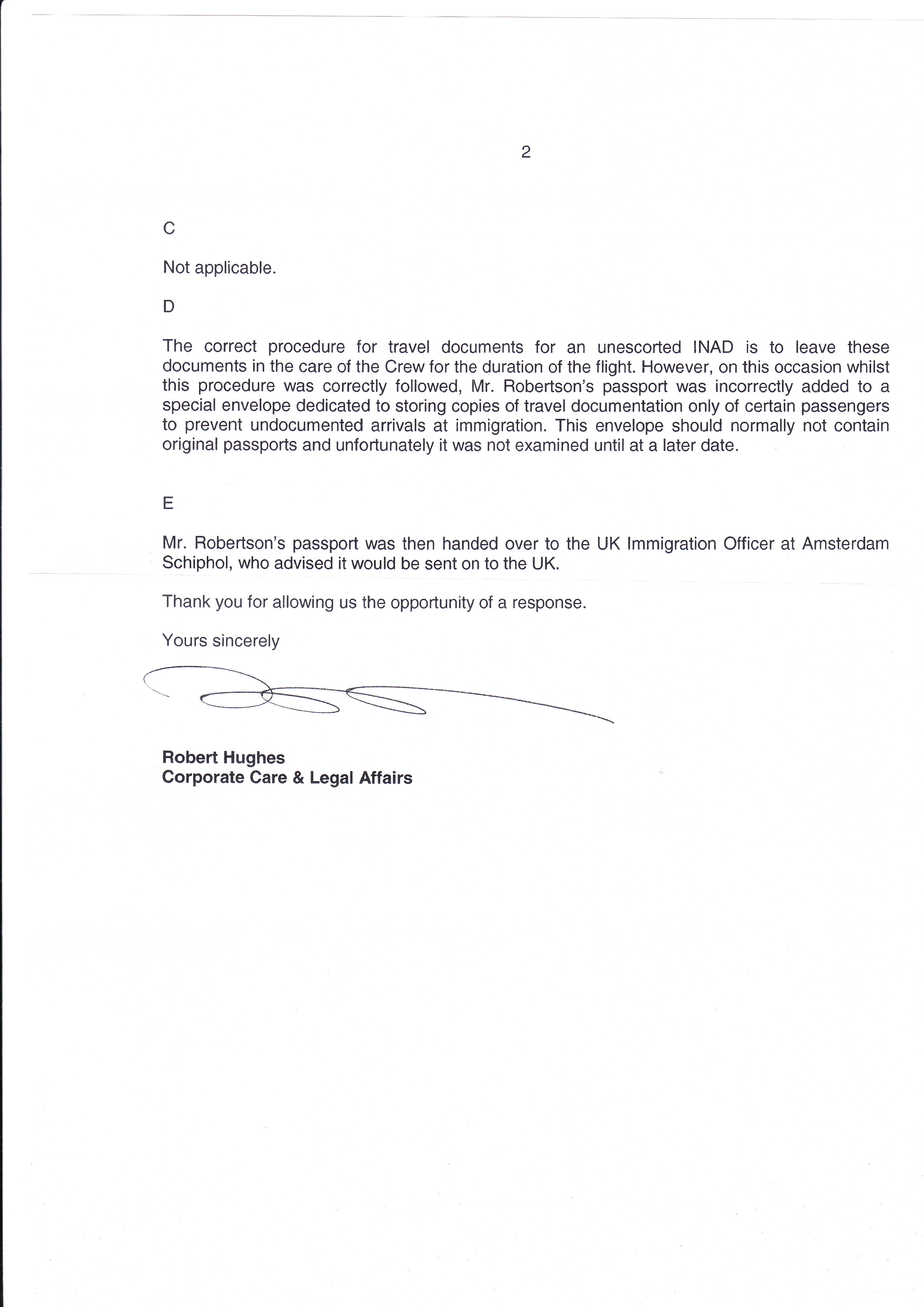 “The two-month delay seems unacceptable and was inordinately long,” Bellingham said. “Although the KLM flight captain and crew on the return flight were incredibly courteous and helpful to Mr. Robertson, I am not impressed with the follow-up action they took [regarding his passport].”