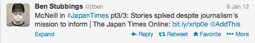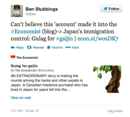 In early 2012, Stubbings tweeted that he did not believe my first-hand account in The Economist about my detention and expulsion from Japan, my home for more than a decade.