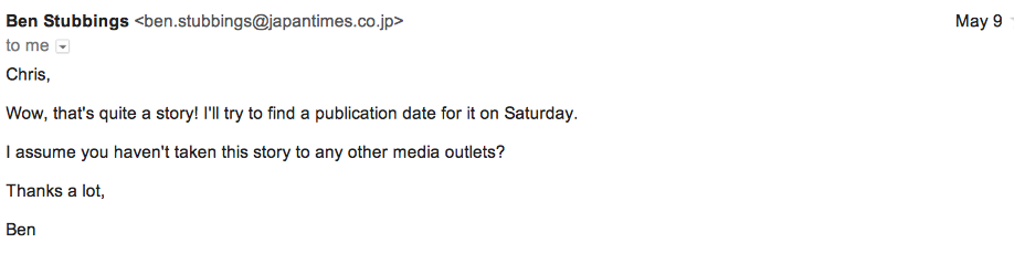 He repeatedly made promises to “run it soon”. This went on for a six-month period, which included dozens of email exchanges and several redrafts, additions, deletions and calls and letters to potential sources, many of whom were not cooperative. Foregoing other paying work, I spent an unusually large amount of time and energy on this story, at my own expense. I worked all hours of the day or night on this, often in extreme Tokyo summer heat. Stubbings would even email me after midnight on a Saturday, seeking revisions which I provided, hoping he’d “run it soon”.