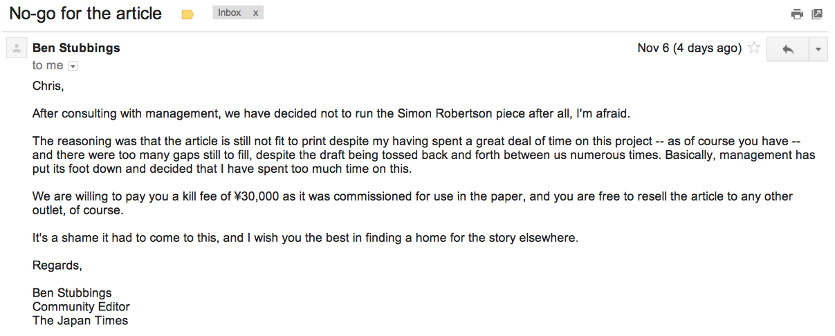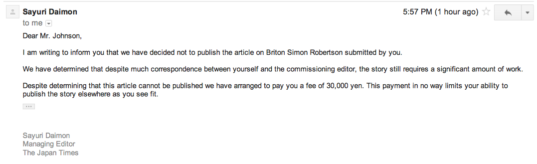 Japan Times Managing Editor Sayuri Daimon sent this email on Nov. 12, 2013, saying the story was axed because it “still requires a significant amount of work”: