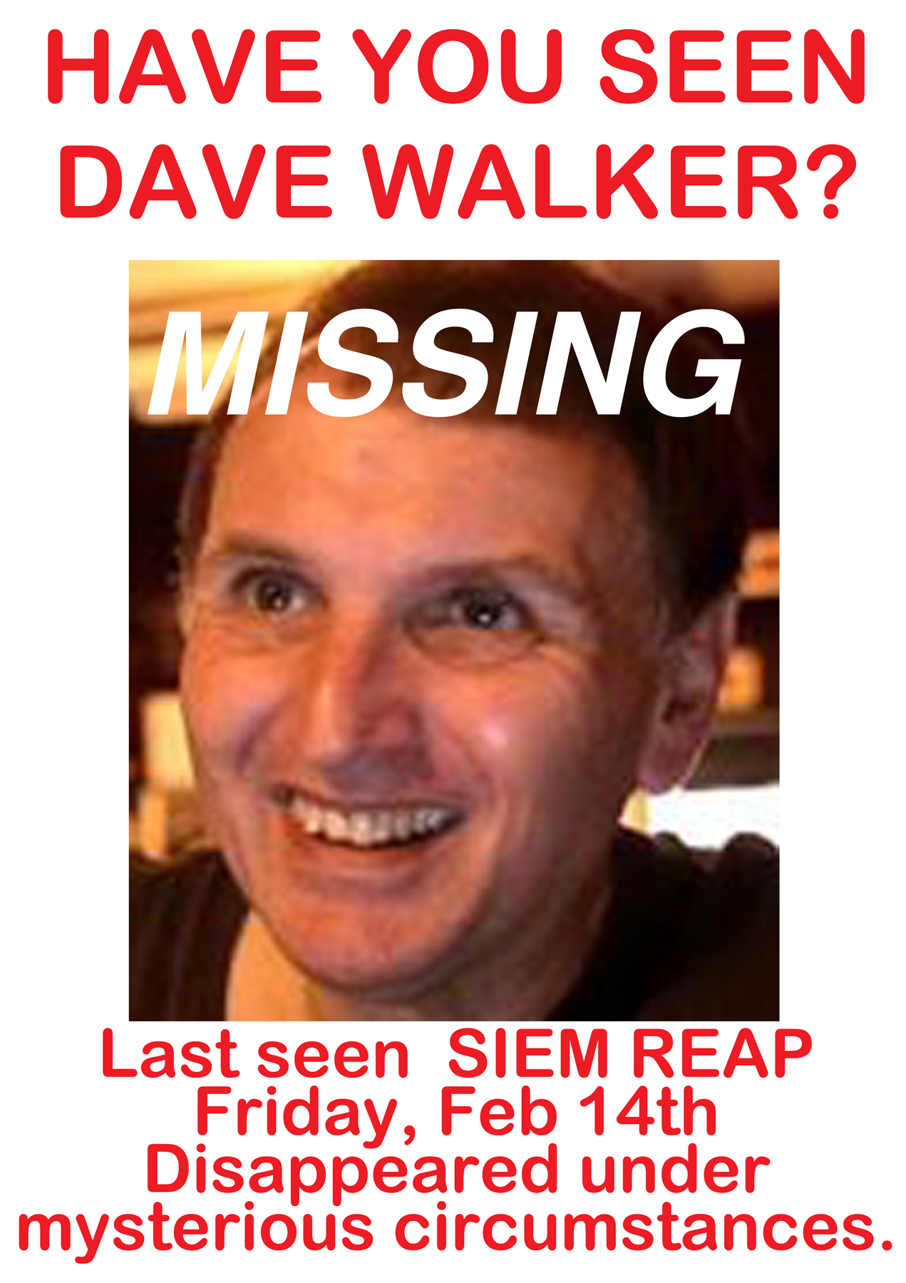 A local press report in February quoted Chhoun as saying he was worried about foul play. Chhoun, a Cambodian who works freelance with foreign journalists, said he contacted hotel staff in Siem Reap who told him that Walker left there on Friday afternoon and did not return.