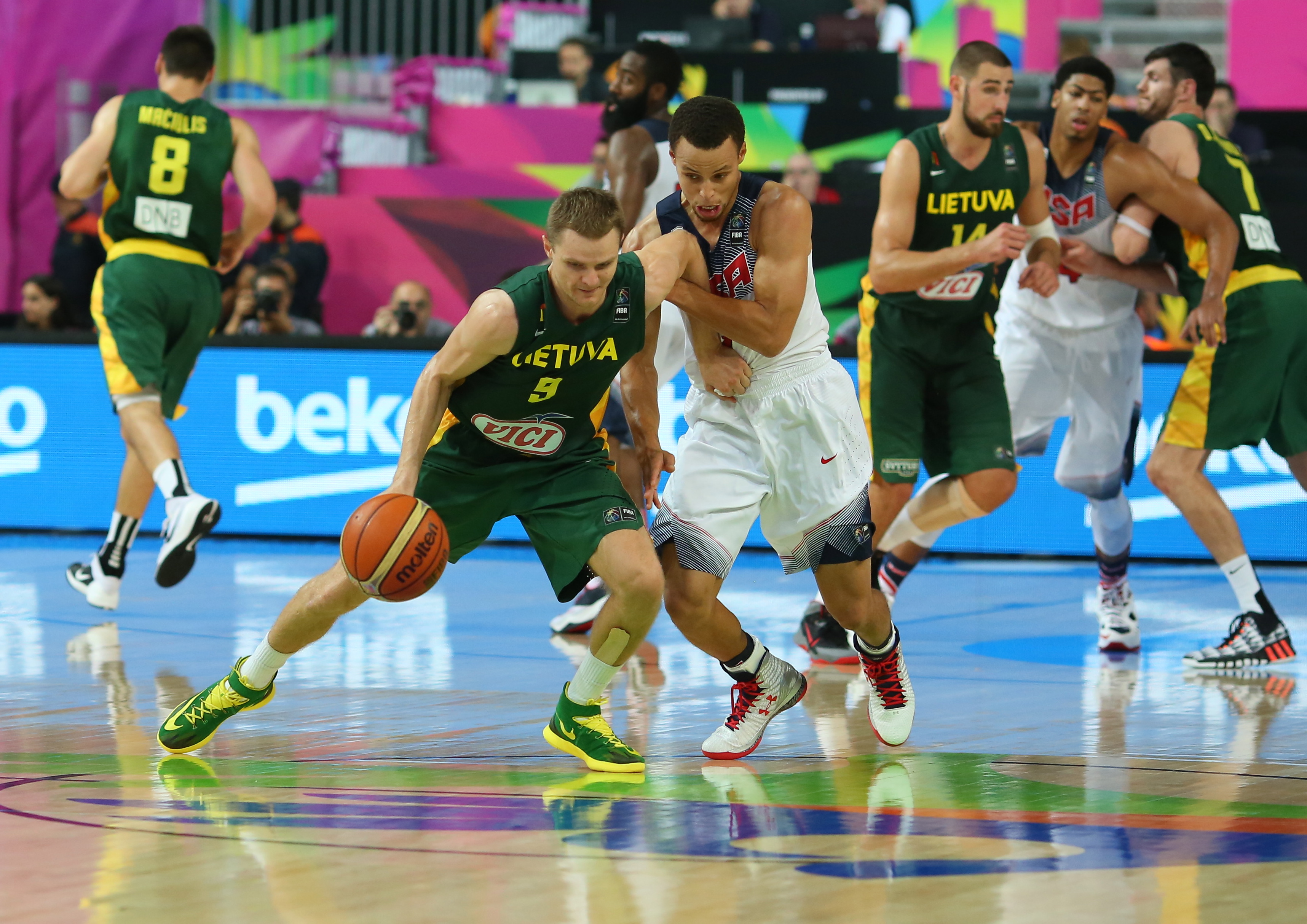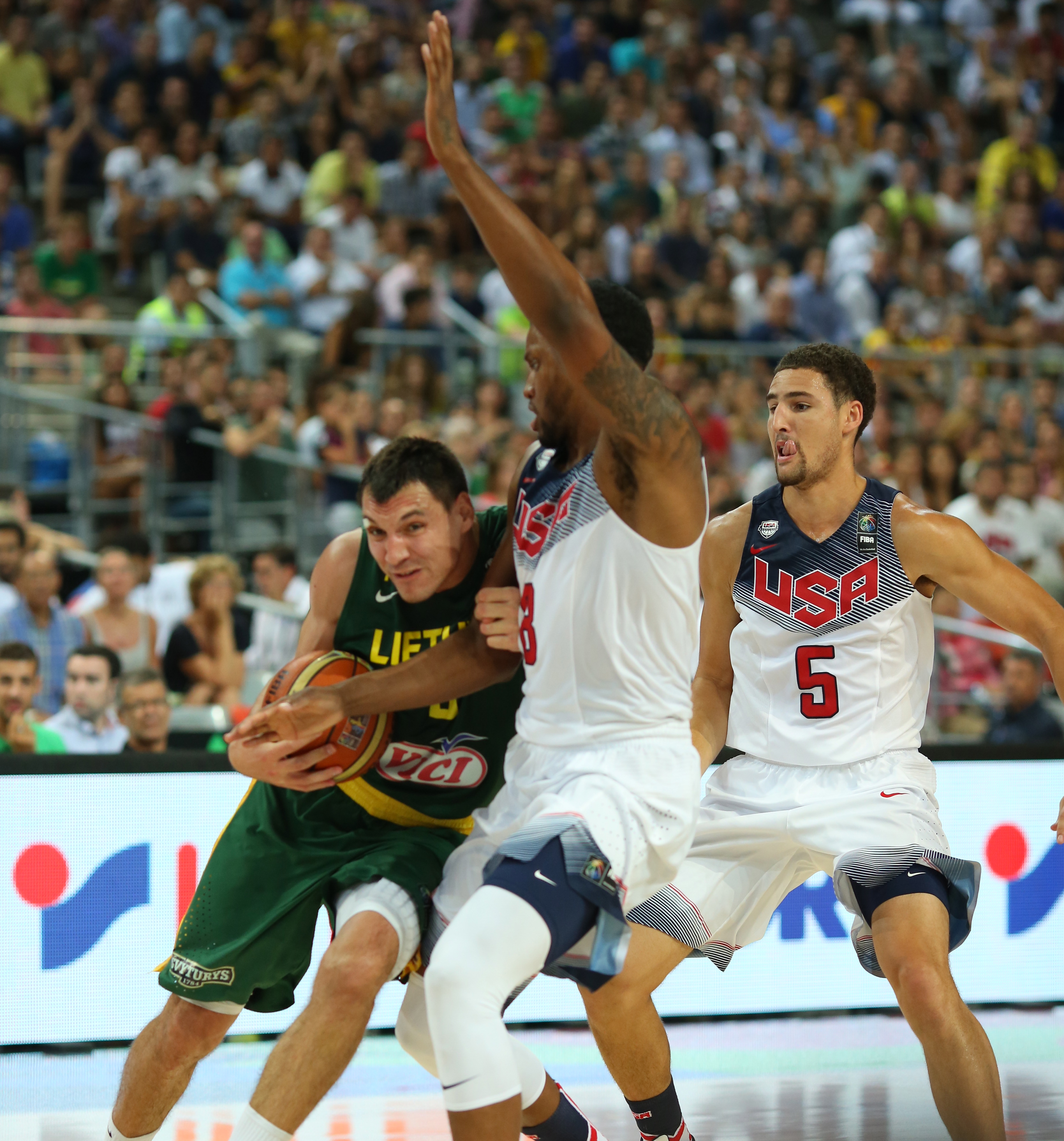 But they couldn’t stop Klay Thompson, the one player on the US who most resembles the type of European sharpshooters familiar to Lithuanians. He had 14 points at half-time, and finished with 16, to lead the US to a 96-68 win.