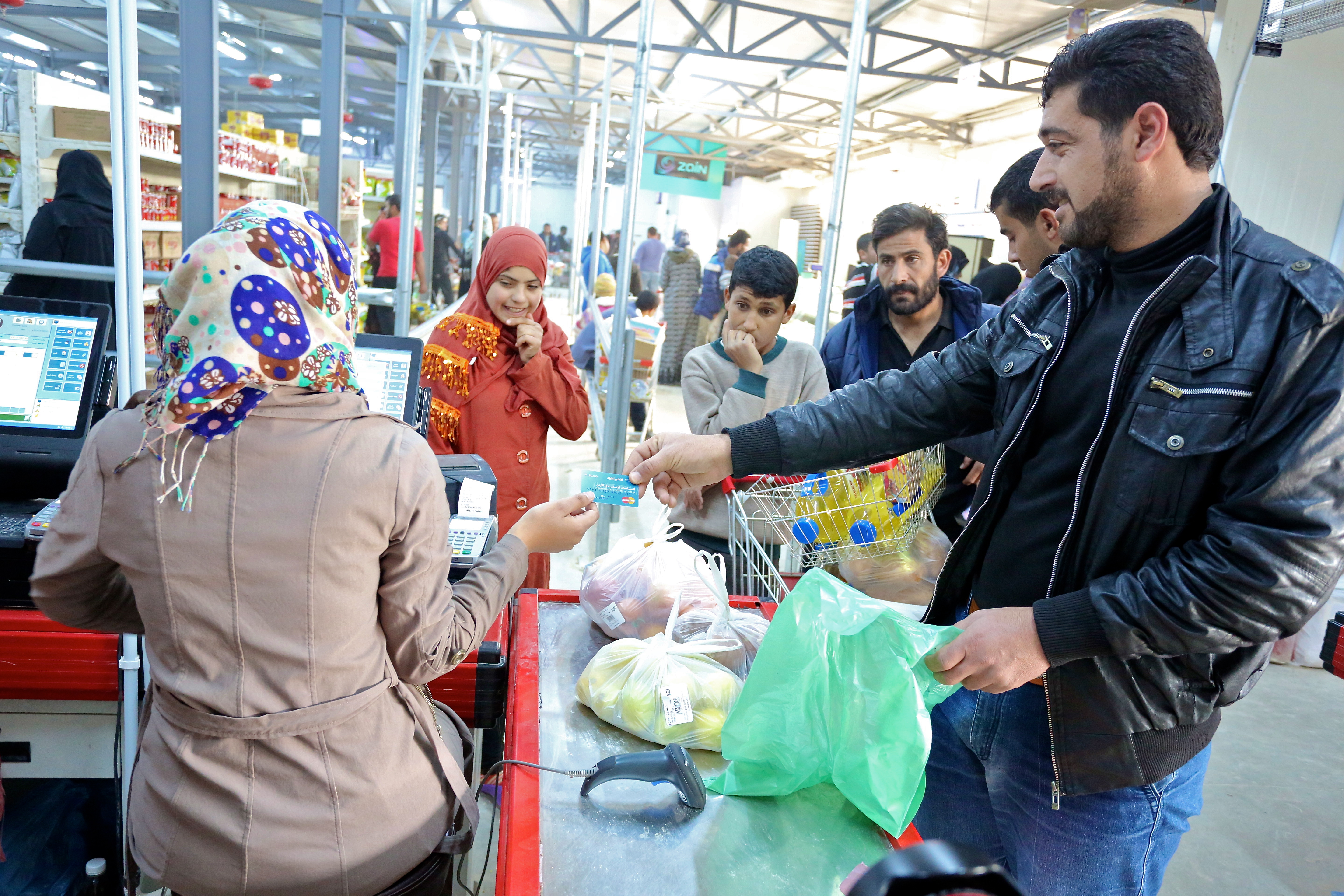 Instead of handing out sacks of mass produced flour or rice, the World Food Programme gives refugees “credit cards” and wires about 24 Jordanian dinars (about 40 dollars) every month into their accounts. Refugees fill shopping carts with items of their choice — such as chicken and chili peppers — and use these “credit cards” at a check-out cashier.