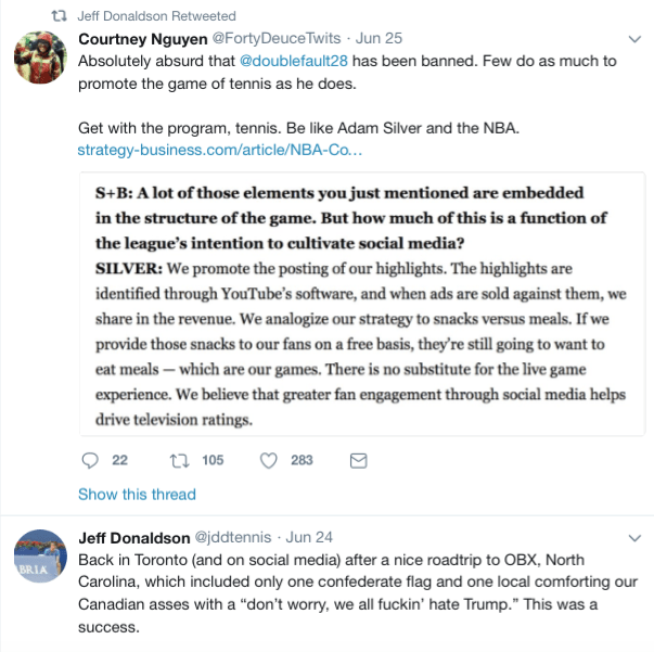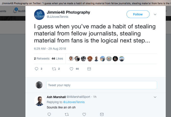 Tennis Canada’s social media coordinator Jeff Donaldson and their official podcaster Mike McIntyre are among many social media users who blatantly steal intellectual property for use on their accounts without formal written expressed permission from photographers.