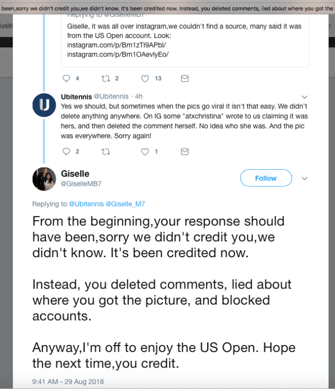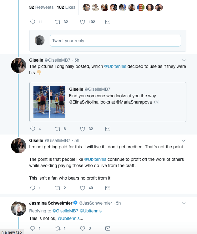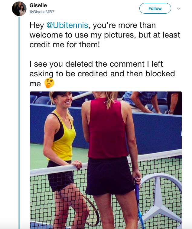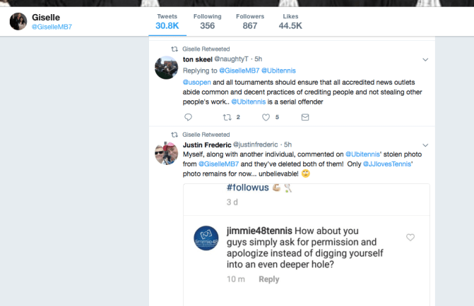 It’s a destructive “culture of theft” where people, including New York Times reporter Ben Rothenburg, WTA employee Courtney Nguyen and employees and athletes with powerful tennis federations such as Tennis Canada, think that they “own” anything posted on the internet, and they can share everything without permission, credit or payment to the hardworking photographers who lug around 20,000 to 40,000 dollars worth of heavy camera equipment in challenging conditions including rain and extreme heat.