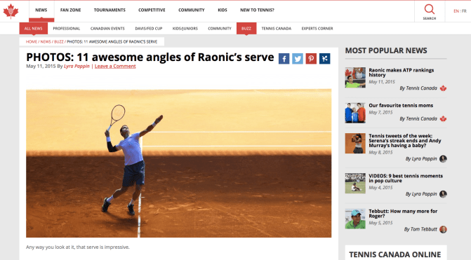 May 11, 2015 — Without my knowledge or expressed written permission, TennisCanada.com made unauthorized usage of my photo of Milos Raonic serving like a bronze statue in the spectacular light of Madrid. I spent years as a professional working photographer developing my knowledge of exposure, saturation and color temperature to create original and unique images such as this. I spent years at tournaments figuring out — by trial and error — the best angle to capture Raonic’s iconic serve. Since interviewing him in Tokyo in 2010, I have studied him carefully in order to anticipate the movements and timing on his serve. I had to go all the way to Madrid, at my own expense, to get the right light and photo position. Art collectors have paid for the purchase of this image. Tennis Canada did not. Tennis Canada most likely used this photo on their social media pages as well.