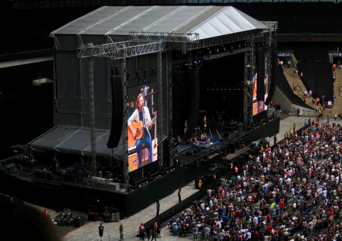 Instead, high up in the third level of the monstrous stadium, we heard a mushy blend of trumpets and violins drowning out the cutting edges of Pete Townshend, a god of the guitar. Amid the cacophony of echoes, we had to struggle to discern two of the most iconic voices in rock — Roger Daltrey and before him, Eddie Vedder.