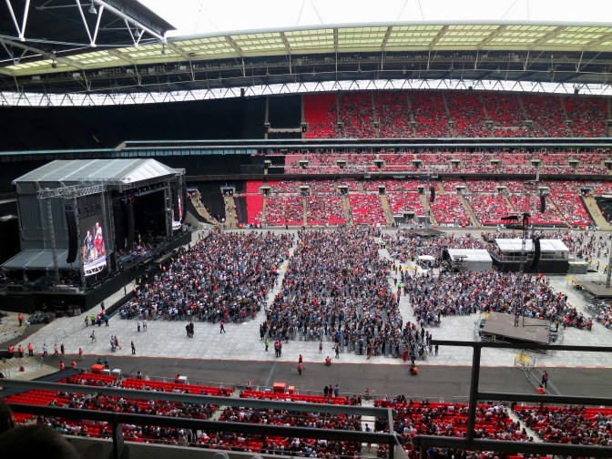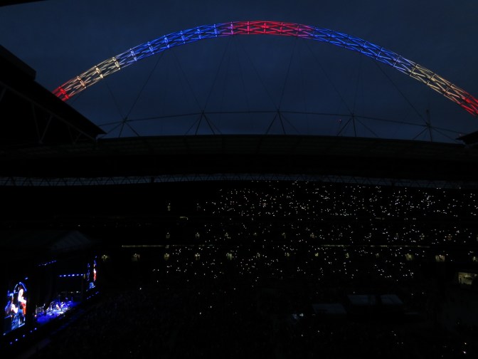 How bad was the mix of sound, bouncing around the oversized stadium and off low, threatening clouds on a cold damp London summer night? I walked around the upper deck and couldn’t find Pete’s guitar. The full range of instruments never cut through the air to my vantage points across the stadium. Half the show I was left wondering if Pete was actually playing, or if he hadn’t found a guitar technician to replace his beloved Alan Rogan, who passed away days before the show.