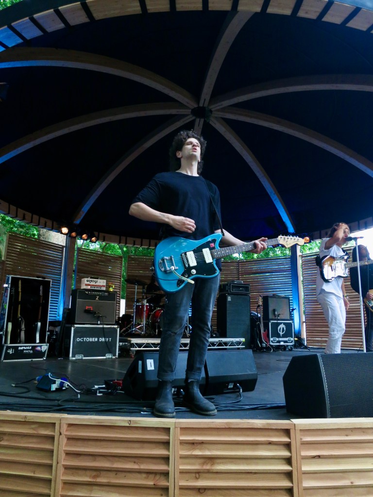 Indeed, October Drift often look like 13-year old boys jumping around on stage. The band are all mates from high school and even earlier. Alex Bispham on bass and Chris Holmes on drums have known each other “since nursery”, and they joined up with Kiran and guitarist Dan Young over mutual love of skateboarding and bands from The National to Nirvana, Smashing Pumpkins, Nick Cave, Radiohead and My Bloody Valentine.