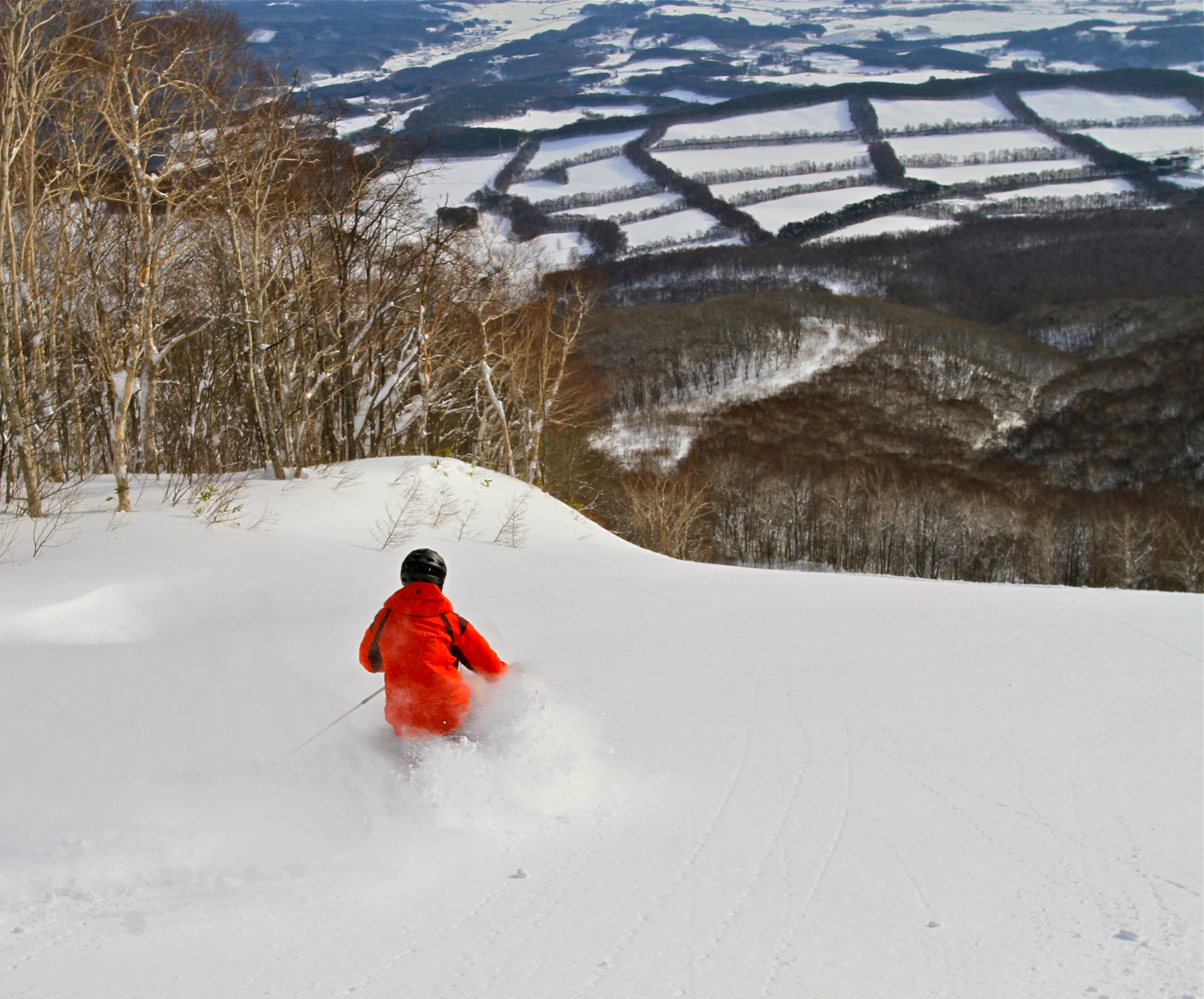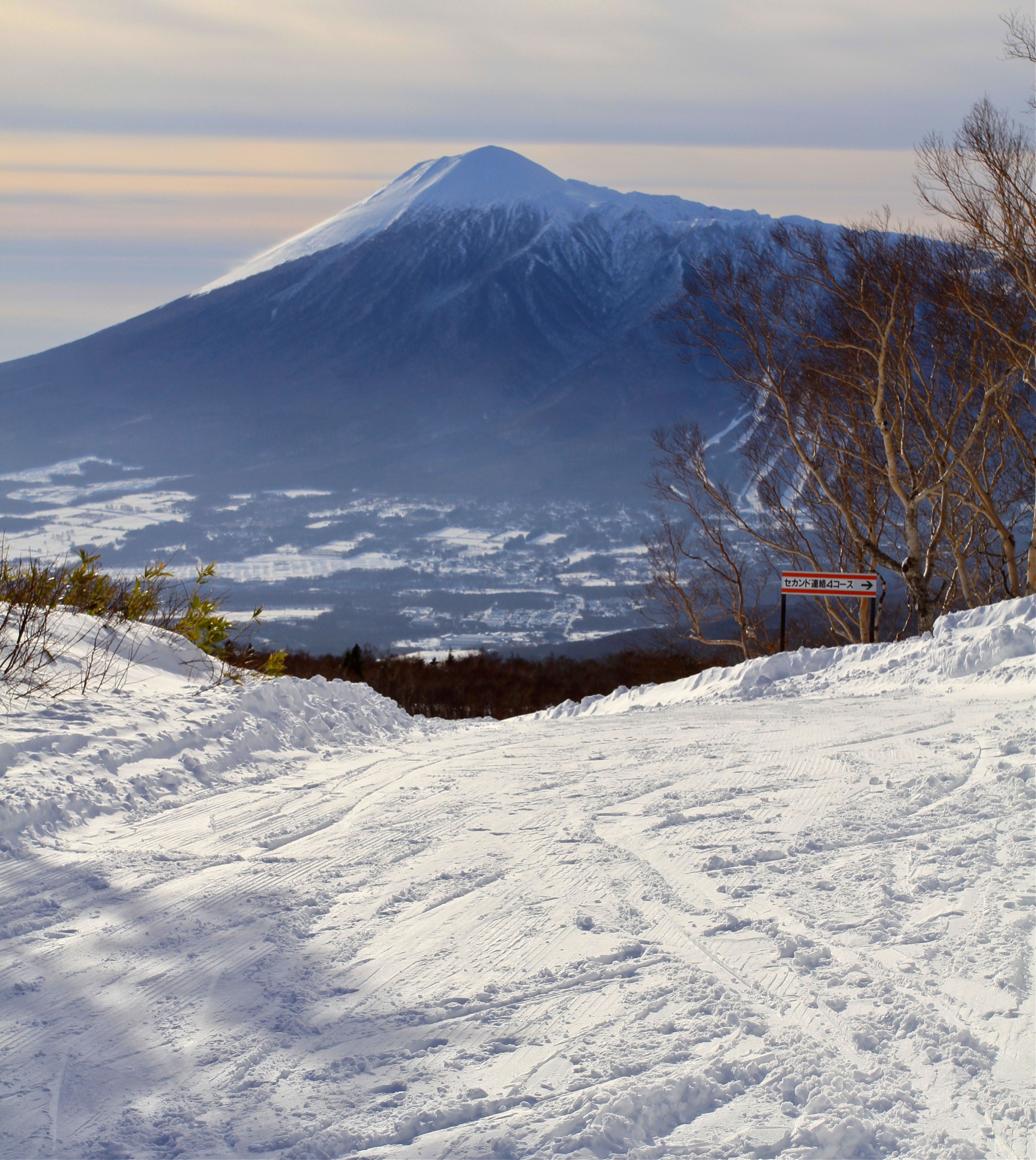 At the bottom, Iwate presides above a vast field of pure snow. Inspired by Aki’s abstract landscapes, I see the scene in bold and simple terms. Awestruck, we repeat the same run just to see this scene again at the end of the run.