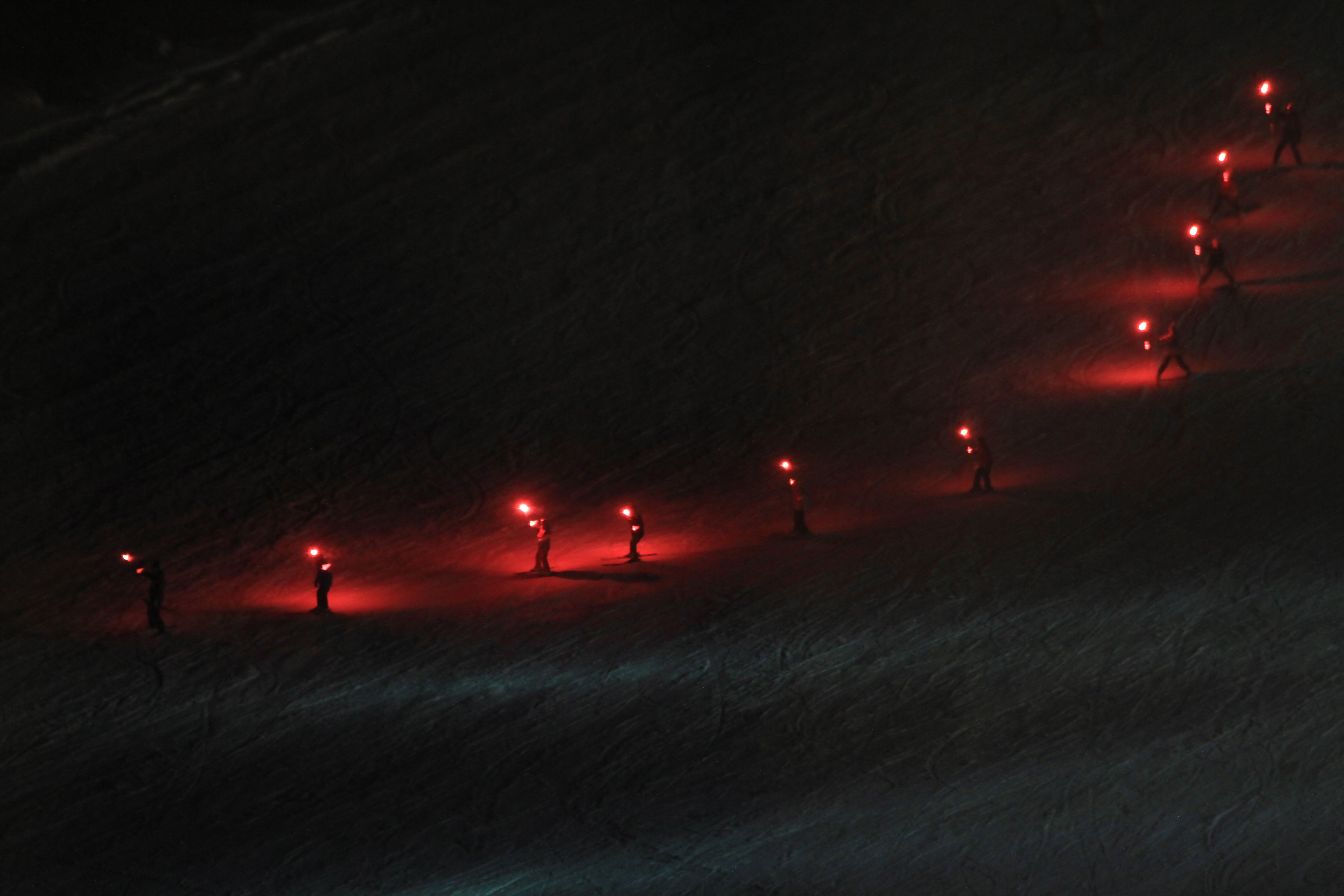Back in my room, I watch a team of skiers descend holding red torch lights in some sort of mysterious ritual, and then the lights go off and the mountain is left to sleep in darkness.
